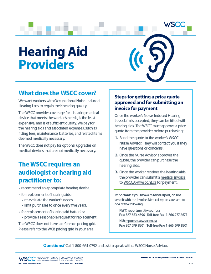 The WSCC provides coverage for a hearing medical device that meets the worker’s needs, is the least expensive, and is of sufficient quality. We pay for the hearing aids and associated expenses, such as fitting fees, maintenance, batteries, and related items deemed medically necessary.